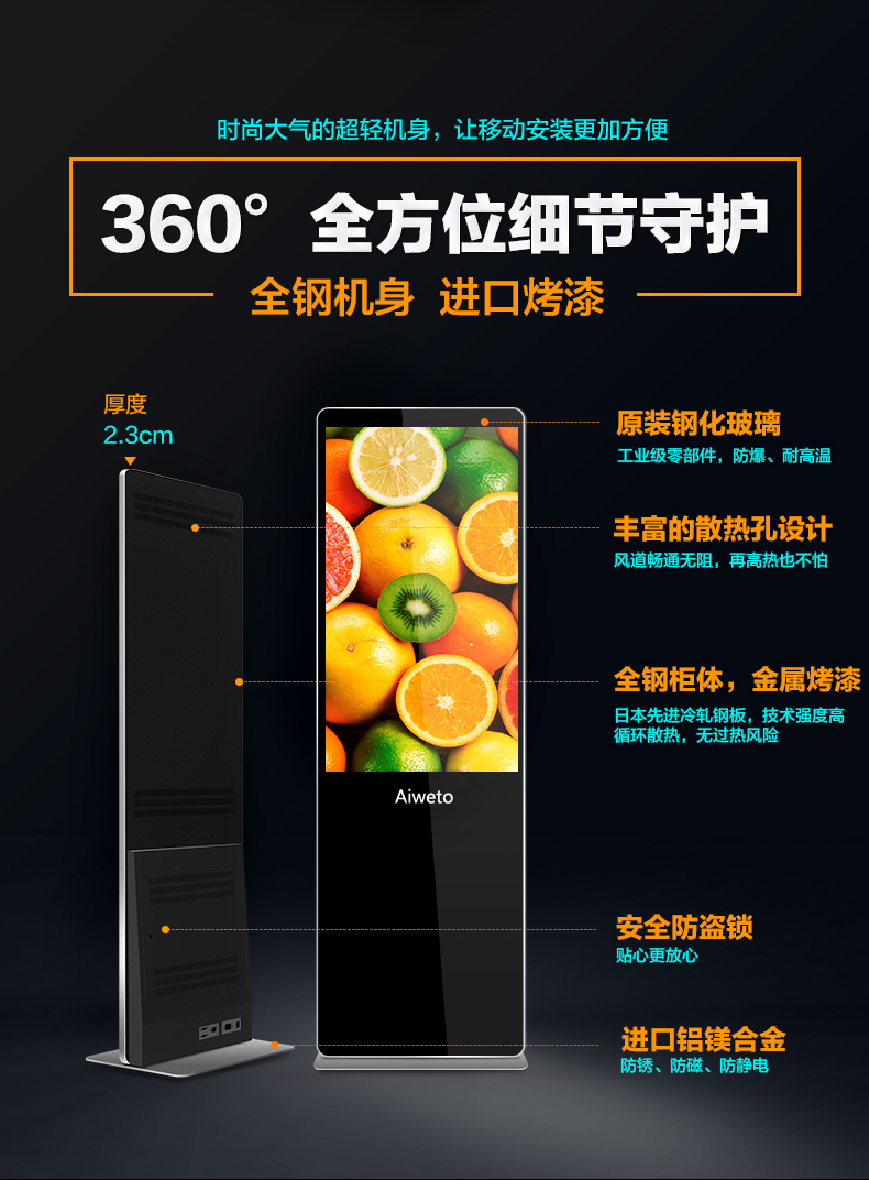 AW-CM490L01 立式觸摸一體機采用全高清(1920*1080)液晶面板,具有178度視角,高對比度和亮度,3D數字降噪,智能消除殘影、重影等失真現象,使得顯示畫面更清晰,穩定,色彩更鮮艷。可廣泛運用于快餐店、訂票處、學校、機場、酒店大堂、交易所、電影院、企業、會展展館、商場等場所。