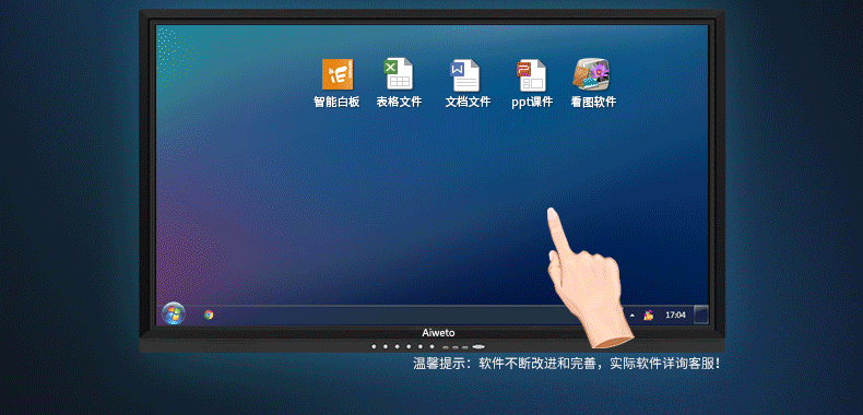 AW系列-多媒體教學一體機,高清大屏顯示,壁掛支架多種使用方式,人性化機型設計,立式與掛式兩種使用方法可交替使用,避免使用環境發生變化時產生的資源浪費問題采用LED背光源長壽命,低功耗,環保節能。智能電子白板,各種文件一鍵加載,多點觸控智能電子白板適用于各種商務會議,支持手寫批注,兼容日常office辦公軟件,本地、U盤、網盤、局域網數據輕松駕馭。書寫流暢,減少視覺誤差,高端企業必備,多重主題背景,筆形色彩,任意選擇。高端配置 讓運行速度,完美兼容WIN7,WIN8 隨意切換。