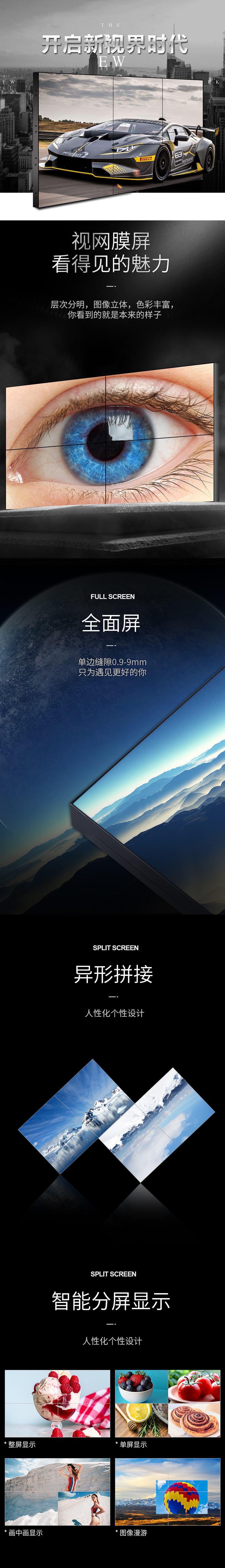 55英寸0.88mm液晶拼接屏應(yīng)具有極高分辨率、可調(diào)亮度和對比度、范圍寬,色彩還原真實(shí),圖像失真小,亮度均勻,顯示清晰,系統(tǒng)操作簡單,維護(hù)方便,使用壽命長。55英寸超窄邊液晶拼接屏,既能單獨(dú)作為顯示器使用,又可以拼接成超大屏幕使用。根據(jù)不同使用需求,實(shí)現(xiàn)可變大也可變小的百變大屏功能:單屏分割顯示、單屏單獨(dú)顯示、任意組合顯示、全屏液晶拼接、雙重拼接液晶屏拼接、豎屏顯示,圖像邊框可選補(bǔ)償或遮蓋,支持?jǐn)?shù)字信號的漫游、縮放拉伸、跨屏顯示,各種顯示預(yù)案的設(shè)置和運(yùn)行,全高清信號實(shí)時處理。